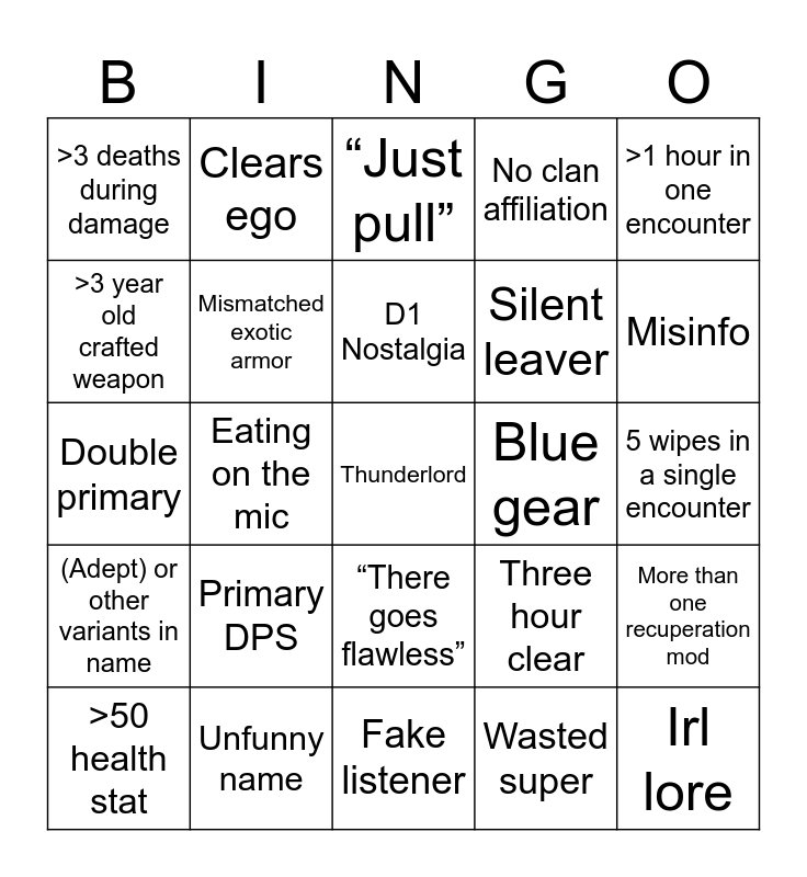This bingo card has a free space and 24 words: Primary DPS, Unfunny name, D1 Nostalgia, >50 health stat, >1 hour in one encounter, >3 deaths during damage, >3 year old crafted weapon, Clears ego, Blue gear, “There goes flawless”, Silent leaver, Double primary, Three hour clear, More than one recuperation mod, Mismatched exotic armor, Wasted super, 5 wipes in a single encounter, “Just pull”, Misinfo, Eating on the mic, Irl lore, (Adept) or other variants in name, No clan affiliation and Fake listener.