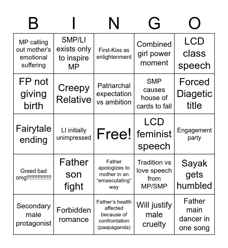 This bingo card has a free space and 24 words: Father son fight, Forbidden romance, Patriarchal expectation vs ambition, Secondary male protagonist, LCD class speech, MP calling out mother's emotional suffering, FP not giving birth, SMP/LI exists only to inspire MP, LCD feminist speech, Father apologizes to mother in an “emasculating” way, SMP causes house of cards to fall, Fairytale ending, Tradition vs love speech from MP/SMP, Sayak gets humbled, Creepy Relative, Will justify male cruelty, Engagement party, First-Kiss as enlightenment, Forced Diagetic title, LI initially unimpressed, Father main dancer in one song, Greed bad omg!!!!!!!!!!!!!!!!, Combined girl power moment and Father’s health affected because of confrontation (paapaganda).