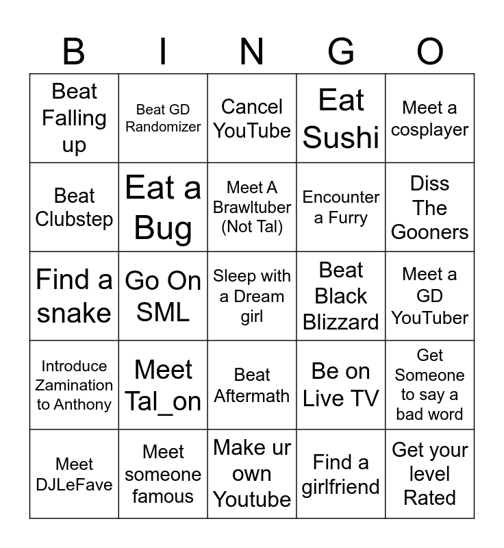 This bingo card has a free space and 24 words: Meet Tal_on, Meet someone famous, Meet A Brawltuber (Not Tal), Meet DJLeFave, Meet a cosplayer, Beat Falling up, Beat Clubstep, Beat GD Randomizer, Beat Black Blizzard, Beat Aftermath, Encounter a Furry, Find a snake, Be on Live TV, Get Someone to say a bad word, Eat a Bug, Find a girlfriend, Meet a GD YouTuber, Cancel YouTube, Diss The Gooners, Go On SML, Get your level Rated, Introduce Zamination to Anthony, Eat Sushi and Make ur own Youtube.