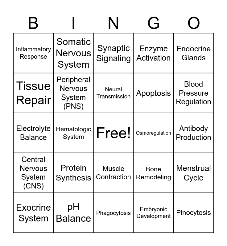 This bingo card has a free space and 33 words: Lymphatic System, Sensory System, Hematologic System, Autonomic Nervous System, Central Nervous System (CNS), Peripheral Nervous System (PNS), Endocrine Glands, Exocrine System, Somatic Nervous System, Respiratory System, Neural Transmission, Synaptic Signaling, Hormonal Regulation, Thermoregulation, Osmoregulation, Blood Pressure Regulation, pH Balance, Electrolyte Balance, Protein Synthesis, Bone Remodeling, Muscle Contraction, Gas Transport, Inflammatory Response, Antibody Production, Phagocytosis, Pinocytosis, Enzyme Activation, Apoptosis, Tissue Repair, Menstrual Cycle, Lactation, Embryonic Development and Cell Differentiation.