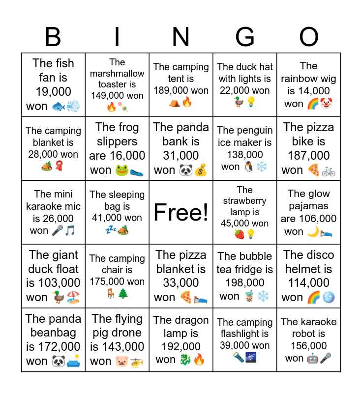 This bingo card has a free space and 35 words: The rubber chicken is 12,000 won ππΈ, The dancing cactus is 37,000 won π΅πΆ, The potato plushie is 7,000 won π₯π, The frog slippers are 16,000 won πΈπ₯Ώ, The pizza blanket is 33,000 won ππ, The duck hat with lights is 22,000 won π¦π‘, The camping blanket is 28,000 won ποΈπ§£, The squeaky banana is 18,000 won ππ, The panda bank is 31,000 won πΌπ°, The bubble gun is 11,000 won π«π«§, The mini karaoke mic is 26,000 won π€π΅, The rainbow wig is 14,000 won ππ€‘, The penguin mug is 25,000 won π§β, The tiny sombrero is 9,000 won π©π, The fish fan is 19,000 won ππ¨, The strawberry lamp is 45,000 won ππ‘, The camping flashlight is 39,000 won π¦π, The sleeping bag is 41,000 won π€ποΈ, The giant duck float is 103,000 won π¦ποΈ, The karaoke robot is 156,000 won π€π€, The bubble tea fridge is 198,000 won π§βοΈ, The panda beanbag is 172,000 won πΌποΈ, The disco helmet is 114,000 won ππͺ©, The flying pig drone is 143,000 won π·π, The camping tent is 189,000 won βΊπ₯, The pizza bike is 187,000 won ππ², The cat-ear headphones are 129,000 won π±π§, The unicorn humidifier is 154,000 won π¦π¨, The penguin ice maker is 138,000 won π§βοΈ, The glow pajamas are 106,000 won ππ, The turtle robot vacuum is 165,000 won π’π§Ή, The dragon lamp is 192,000 won ππ₯, The camping chair is 175,000 won πͺπ², The marshmallow toaster is 149,000 won π₯π‘ and The emoji projector is 178,000 won ππ½οΈ.