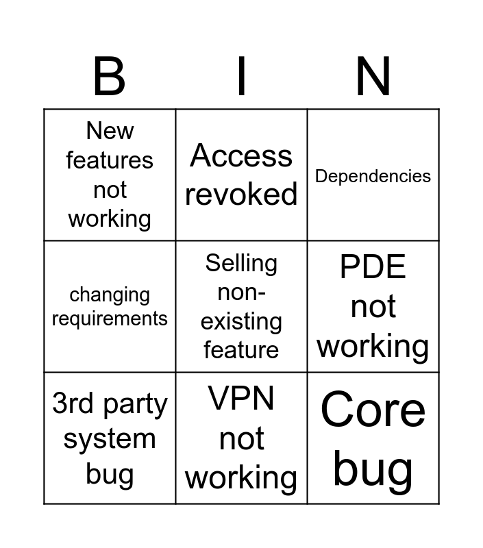 This bingo card has a free space and 8 words: PDE not working, Dependencies, Access revoked, 3rd party system bug, New features not working, Core bug, changing requirements and VPN not working.