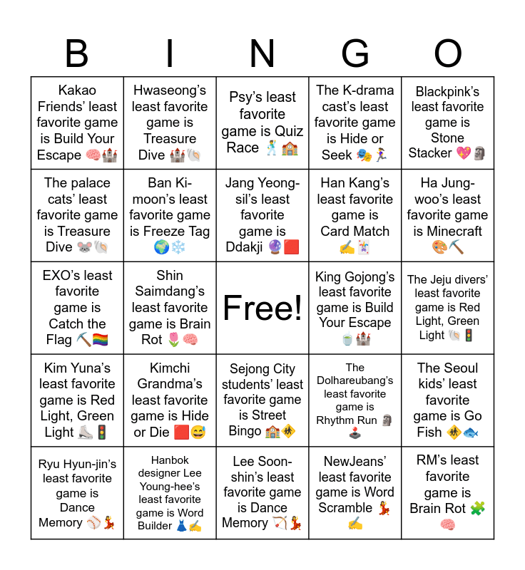 This bingo card has a free space and 33 words: King Sejong’s least favorite game is Hide and Seek 🏃♂️📚, Admiral Yi Sun-sin’s least favorite game is Card Match ⚓🃏, Shin Saimdang’s least favorite game is Brain Rot 🌷🧠, BTS’s least favorite game is Go Fish 🎶🐟, Kim Yuna’s least favorite game is Red Light, Green Light ⛸️🚦, Ban Ki-moon’s least favorite game is Freeze Tag 🌍❄️, Blackpink’s least favorite game is Stone Stacker 💖🗿, Ryu Hyun-jin’s least favorite game is Dance Memory ⚾💃, Hwaseong’s least favorite game is Treasure Dive 🏰🐚, IU’s least favorite game is Mouse Chase Maze 🌲🐭, Jang Yeong-sil’s least favorite game is Ddakji 🔮🟥, Psy’s least favorite game is Quiz Race 🕺🏫, Son Heung-min’s least favorite game is Smile Challenge ⚽😁, Park Ji-sung’s least favorite game is Ice Puzzle Match 🏳️🌈🧊, King Gojong’s least favorite game is Build Your Escape 🍵🏰, Ha Jung-woo’s least favorite game is Minecraft 🎨⛏️, Hanbok designer Lee Young-hee’s least favorite game is Word Builder 👗✍️, EXO’s least favorite game is Catch the Flag ⛏️🏳️🌈, Kimchi Grandma’s least favorite game is Hide or Die 🟥😅, The Dolhareubang’s least favorite game is Rhythm Run 🗿🕹️, Sejong City students’ least favorite game is Street Bingo 🏫🚸, The Gyeongbokgung guards’ least favorite game is Guess the Drawing 🏯🎨, Kakao Friends’ least favorite game is Build Your Escape 🧠🏰, The Jeju divers’ least favorite game is Red Light, Green Light 🐚🚦, Lee Soon-shin’s least favorite game is Dance Memory 🏹💃, RM’s least favorite game is Brain Rot 🧩🧠, The K-drama cast’s least favorite game is Hide or Seek 🎭🏃♀️, Han Kang’s least favorite game is Card Match ✍️🃏, The palace cats’ least favorite game is Treasure Dive 🐭🐚, The Seoul kids’ least favorite game is Go Fish 🚸🐟, Park Bo-gum’s least favorite game is Stone Stacker 😁🗿, NewJeans’ least favorite game is Word Scramble 💃✍️ and Chungha’s least favorite game is Blue Marble 🕹️🌊.