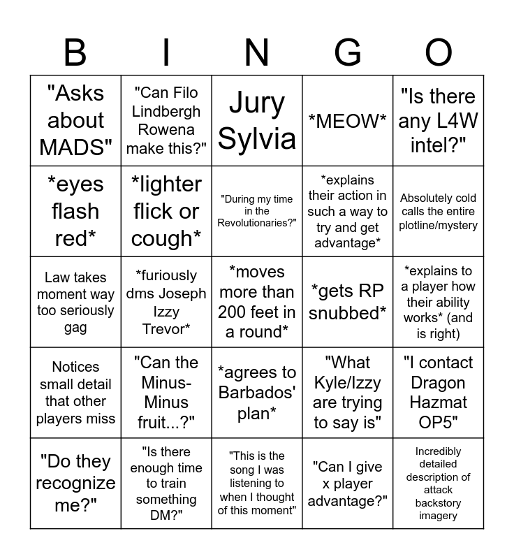 This bingo card has a free space and 24 words: "Can the Minus-Minus fruit...?", "Is there enough time to train something DM?", "During my time in the Revolutionaries?", "Do they recognize me?", "Is there any L4W intel?", "Asks about MADS", *eyes flash red*, "Can Filo Lindbergh Rowena make this?", *gets RP snubbed*, *agrees to Barbados' plan*, *explains their action in such a way to try and get advantage*, Law takes moment way too seriously gag, "What Kyle/Izzy are trying to say is", "I contact Dragon Hazmat OP5", *lighter flick or cough*, "Can I give x player advantage?", *explains to a player how their ability works* (and is right), Jury Sylvia, Absolutely cold calls the entire plotline/mystery, *furiously dms Joseph Izzy Trevor*, Incredibly detailed description of attack backstory imagery, Notices small detail that other players miss, *MEOW* and "This is the song I was listening to when I thought of this moment".