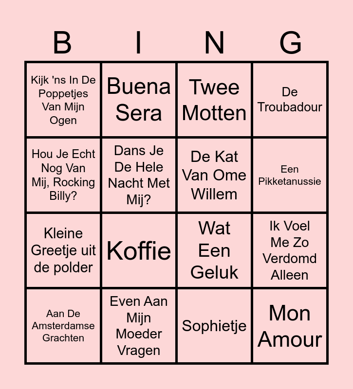 This bingo card has 46 words: Free!, Aan De Amsterdamse Grachten, Alle Duiven Op De Dam, Als De Klok Van Arnemuiden, Batje Vier, Brussel, Buena Sera, Daar Bij de Waterkant, Dans Je De Hele Nacht Met Mij?, Dat Afgezaagde Zinnetje, De Kat Van Ome Willem, De Troubadour, De Wandelclub, De Zuiderzee Ballade, Ding-A-Dong, Een Beetje, Een Pikketanussie, Even Aan Mijn Moeder Vragen, Geef Mij Maar Amsterdam, Hou Je Echt Nog Van Mij, Rocking Billy?, Ik Voel Me Zo Verdomd Alleen, Ja Zuster Nee Zuster, Kijk 'ns In De Poppetjes Van Mijn Ogen, Kleine Greetje uit de polder, Kleine Jodeljongen, Koffie, Mexico, M'n Opa, M'n Wiegie Was 'n Stijfselkissie, Mon Amour, Oh Johnny, Ome Jan, Pruimenpap, Que sera sera, Reisje Langs De Rijn, Sammy, Sophietje, 'T Was Aan De Costa Del Sol, The Second Waltz, Tiroler Holzhacker, Tulpen Uit Amsterdam, Twee Motten, Wat Een Geluk, Wat Voor Weer Zou Het Zijn In Den Haag, You'll Never Walk Alone and Zeg Niet Nee.