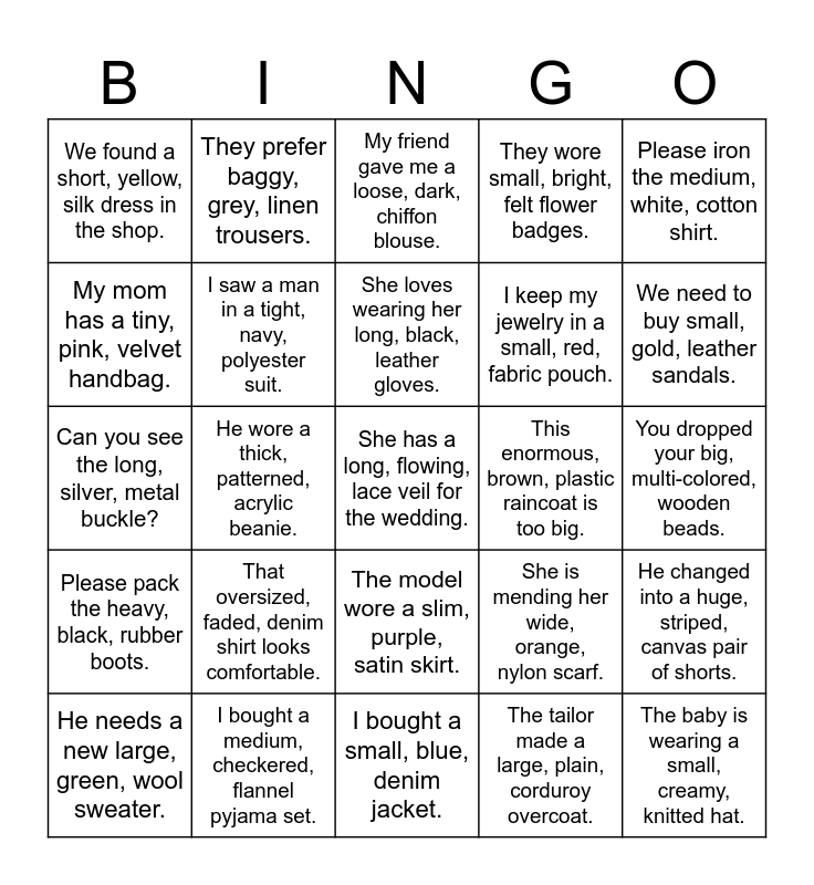This bingo card has 25 words: That oversized, faded, denim shirt looks comfortable., I bought a small, blue, denim jacket., She loves wearing her long, black, leather gloves., He needs a new large, green, wool sweater., Please iron the medium, white, cotton shirt., We found a short, yellow, silk dress in the shop., My mom has a tiny, pink, velvet handbag., They prefer baggy, grey, linen trousers., This enormous, brown, plastic raincoat is too big., The model wore a slim, purple, satin skirt., I keep my jewelry in a small, red, fabric pouch., Can you see the long, silver, metal buckle?, She is mending her wide, orange, nylon scarf., He changed into a huge, striped, canvas pair of shorts., I saw a man in a tight, navy, polyester suit., The baby is wearing a small, creamy, knitted hat., You dropped your big, multi-colored, wooden beads., My friend gave me a loose, dark, chiffon blouse., We need to buy small, gold, leather sandals., He wore a thick, patterned, acrylic beanie., She has a long, flowing, lace veil for the wedding., I bought a medium, checkered, flannel pyjama set., Please pack the heavy, black, rubber boots., They wore small, bright, felt flower badges. and The tailor made a large, plain, corduroy overcoat..