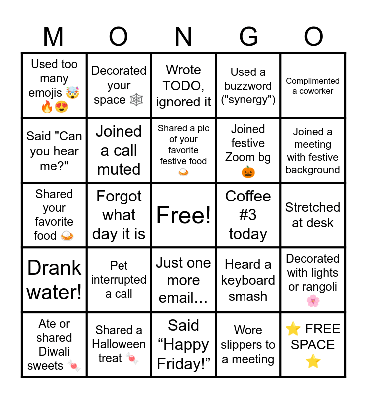 This bingo card has a free space and 37 words: Sent a GIF on Slack, Shared a meme, Changed Zoom background, Joined a call muted, Decorated with lights or rangoli πΈ, Pet interrupted a call, Shared a pic of your favorite festive food π, Made a pun or dad joke, Complimented a coworker, Had 3+ tabs open, Forgot what day it is, Used a buzzword ("synergy"), βοΈ FREE SPACE βοΈ, Stretched at desk, Said "Can you hear me?", Drank water!, Shared a picture of pumpkin π, Wrote TODO, ignored it, Just one more emailβ¦, Coffee #3 today, Used too many emojis π€―π₯π, Joined a meeting with festive background, Ate or shared Diwali sweets π¬, Said βHappy Friday!β, Shared a picture of diyas πͺ, Wore slippers to a meeting, Decorated your space πΈοΈ, Said βLetβs circle backβ, Desk snack time, Worked past lunch, Replied all accidentally, Shared a Halloween treat π¬, Shared your favorite food π, Decorated your desk π, Heard a keyboard smash, Joined festive Zoom bg π and Shared a festive food pic π.