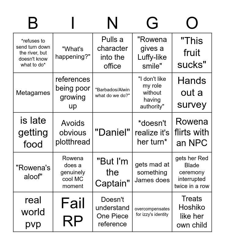 This bingo card has a free space and 24 words: Rowena does a genuinely cool MC moment, Fail RP, "Barbados/Alwin what do we do?", real world pvp, "This fruit sucks", *refuses to send turn down the river, but doesn't know what to do*, Metagames, "What's happening?", *doesn't realize it's her turn*, "But I'm the Captain", "I don't like my role without having authority", is late getting food, gets mad at something James does, gets her Red Blade ceremony interrupted twice in a row, references being poor growing up, overcompensates for izzy's identity, Rowena flirts with an NPC, Pulls a character into the office, Hands out a survey, Avoids obvious plotthread, Treats Hoshiko like her own child, "Rowena's aloof", "Rowena gives a Luffy-like smile" and Doesn't understand One Piece reference.