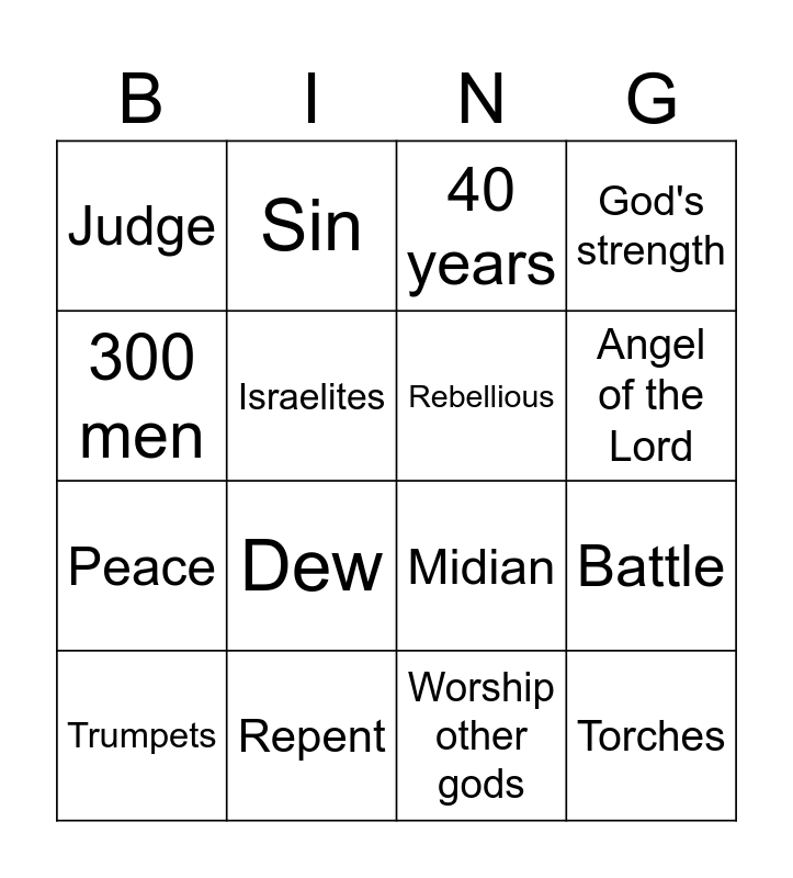This bingo card has 24 words: Fleece, God, Angel of the Lord, Gideon, 300 men, Judge, Israelites, Sin, Repent, Delivered, Peace, Midian, Faith, Obedient, Rebellious, Consequences, Worship other gods, 40 years, Dew, Battle, Trumpets, Torches, God's strength and Oppression.