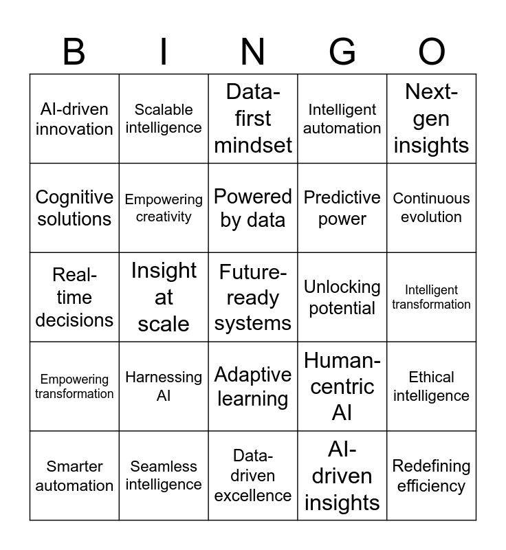 This bingo card has a free space and 24 words: Harnessing AI, Seamless intelligence, Powered by data, Smarter automation, Next-gen insights, AI-driven innovation, Cognitive solutions, Scalable intelligence, Unlocking potential, Adaptive learning, Predictive power, Real-time decisions, Human-centric AI, Ethical intelligence, Empowering creativity, AI-driven insights, Intelligent transformation, Data-first mindset, Continuous evolution, Insight at scale, Redefining efficiency, Empowering transformation, Intelligent automation and Data-driven excellence.
