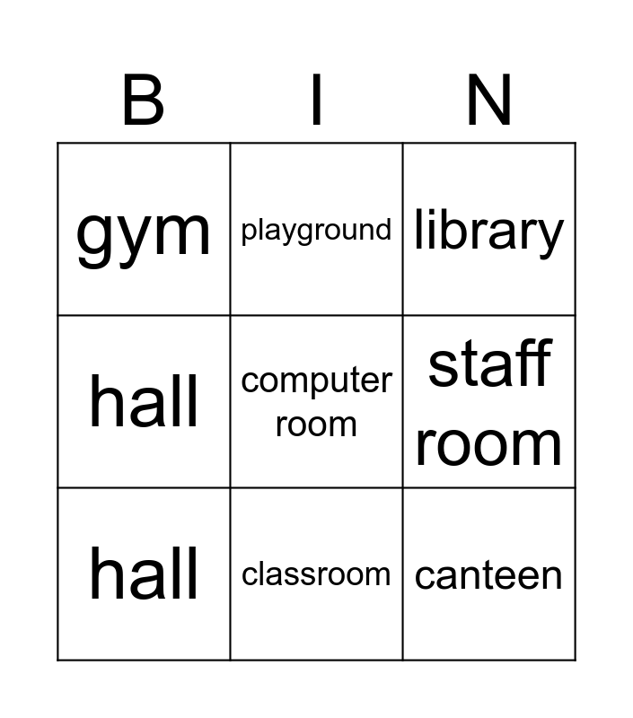 This bingo card has a free space and 8 words: staff room, library, playground, hall, gym, canteen, hall and classroom.