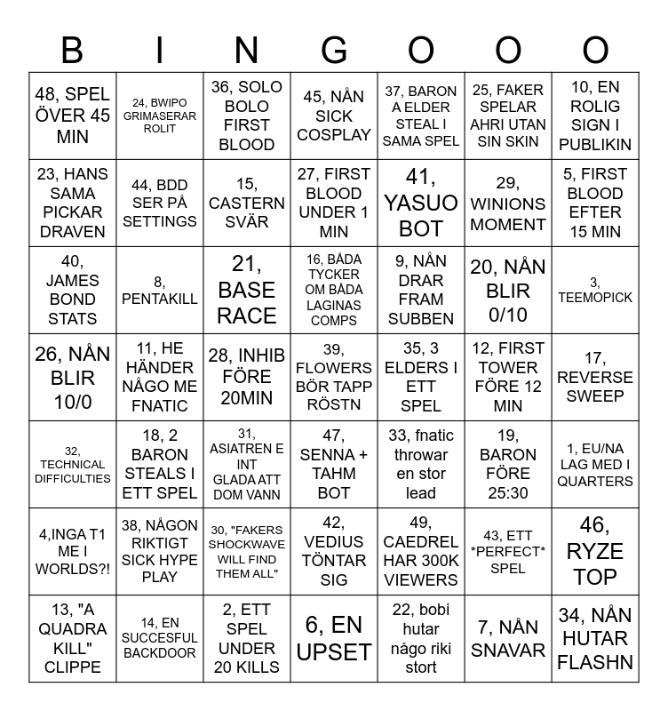 This bingo card has 49 words: 43, ETT *PERFECT* SPEL, 29, WINIONS MOMENT, 22, bobi hutar någo riki stort, 11, HE HÄNDER NÅGO ME FNATIC, 21, BASE RACE, 17, REVERSE SWEEP, 24, BWIPO GRIMASERAR ROLIT, 2, ETT SPEL UNDER 20 KILLS, 25, FAKER SPELAR AHRI UTAN SIN SKIN, 47, SENNA + TAHM BOT, 10, EN ROLIG SIGN I PUBLIKIN, 45, NÅN SICK COSPLAY, 20, NÅN BLIR 0/10, 9, NÅN DRAR FRAM SUBBEN, 38, NÅGON RIKTIGT SICK HYPE PLAY, 12, FIRST TOWER FÖRE 12 MIN, 23, HANS SAMA PICKAR DRAVEN, 5, FIRST BLOOD EFTER 15 MIN, 46, RYZE TOP, 37, BARON A ELDER STEAL I SAMA SPEL, 41, YASUO BOT, 28, INHIB FÖRE 20MIN, 48, SPEL ÖVER 45 MIN, 44, BDD SER PÅ SETTINGS, 13, "A QUADRA KILL" CLIPPE, 15, CASTERN SVÄR, 3, TEEMOPICK, 14, EN SUCCESFUL BACKDOOR, 16, BÅDA TYCKER OM BÅDA LAGINAS COMPS, 8, PENTAKILL, 34, NÅN HUTAR FLASHN, 35, 3 ELDERS I ETT SPEL, 4,INGA T1 ME I WORLDS?!, 30, "FAKERS SHOCKWAVE WILL FIND THEM ALL", 26, NÅN BLIR 10/0, 33, fnatic throwar en stor lead, 19, BARON FÖRE 25:30, 1, EU/NA LAG MED I QUARTERS, 40, JAMES BOND STATS, 31, ASIATREN E INT GLADA ATT DOM VANN, 42, VEDIUS TÖNTAR SIG, 32, TECHNICAL DIFFICULTIES, 39, FLOWERS BÖR TAPP RÖSTN, 6, EN UPSET, 27, FIRST BLOOD UNDER 1 MIN, 36, SOLO BOLO FIRST BLOOD, 49, CAEDREL HAR 300K VIEWERS, 18, 2 BARON STEALS I ETT SPEL and 7, NÅN SNAVAR.