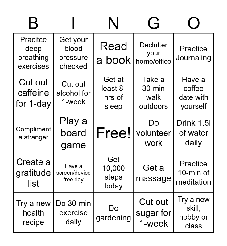 This bingo card has a free space and 24 words: Have a screen/device free day, Do 30-min exercise daily, Get at least 8-hrs of sleep, Try a new health recipe, Practice Journaling, Pracitce deep breathing exercises, Cut out caffeine for 1-day, Get your blood pressure checked, Do volunteer work, Get 10,000 steps today, Take a 30-min walk outdoors, Compliment a stranger, Get a massage, Practice 10-min of meditation, Cut out alcohol for 1-week, Cut out sugar for 1-week, Drink 1.5l of water daily, Read a book, Have a coffee date with yourself, Play a board game, Try a new skill, hobby or class, Create a gratitude list, Declutter your home/office and Do gardening.