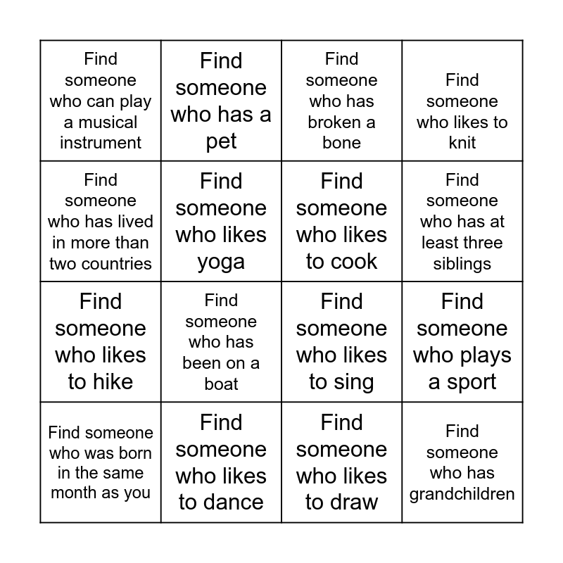 This bingo card has 16 words: Find someone who was born in the same month as you, Find someone who likes to dance, Find someone who has broken a bone, Find someone who likes to knit, Find someone who has lived in more than two countries, Find someone who has a pet, Find someone who likes to sing, Find someone who plays a sport, Find someone who can play a musical instrument, Find someone who likes yoga, Find someone who likes to draw, Find someone who has at least three siblings, Find someone who likes to hike, Find someone who has been on a boat, Find someone who likes to cook and Find someone who has grandchildren.