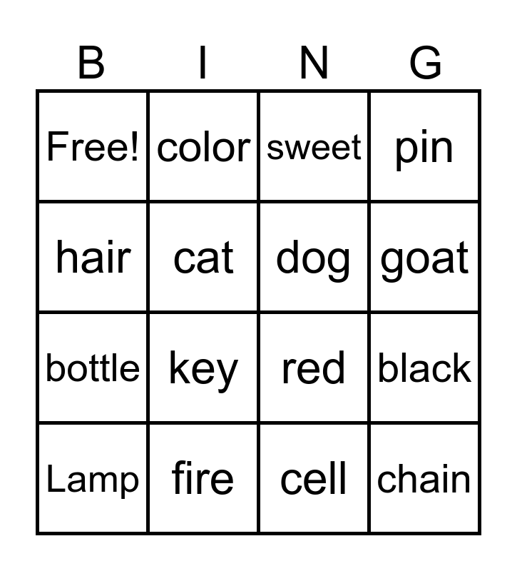 This bingo card has 16 words: Lamp, fire, sweet, pin, hair, color, red, black, Free!, cat, cell, goat, bottle, key, dog and chain.