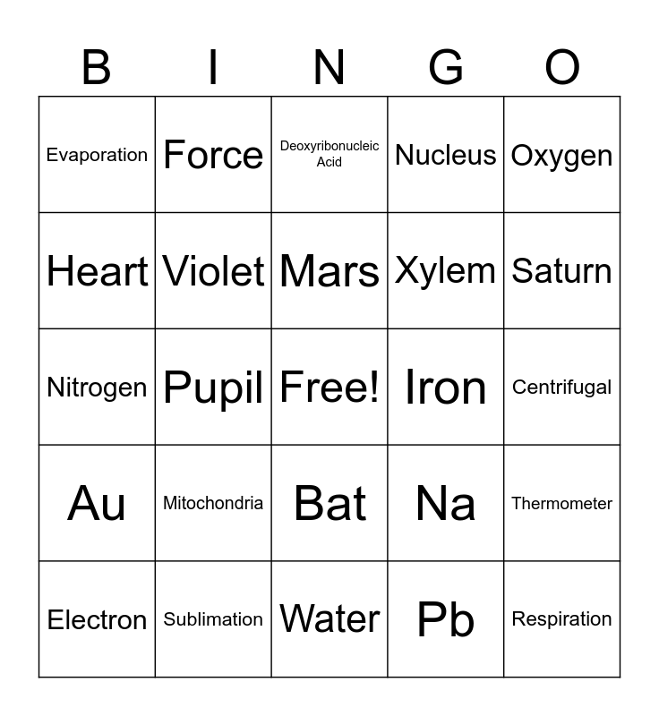 This bingo card has a free space and 25 words: Mitochondria, Water, Mars, Electron, Oxygen, Evaporation, Heart, Force, Iron, Bat, Xylem, Nitrogen, Na, Thermometer, Violet, Pigeon, Centrifugal, Deoxyribonucleic Acid, Saturn, Pupil, Respiration, Sublimation, Au, Nucleus and Pb.