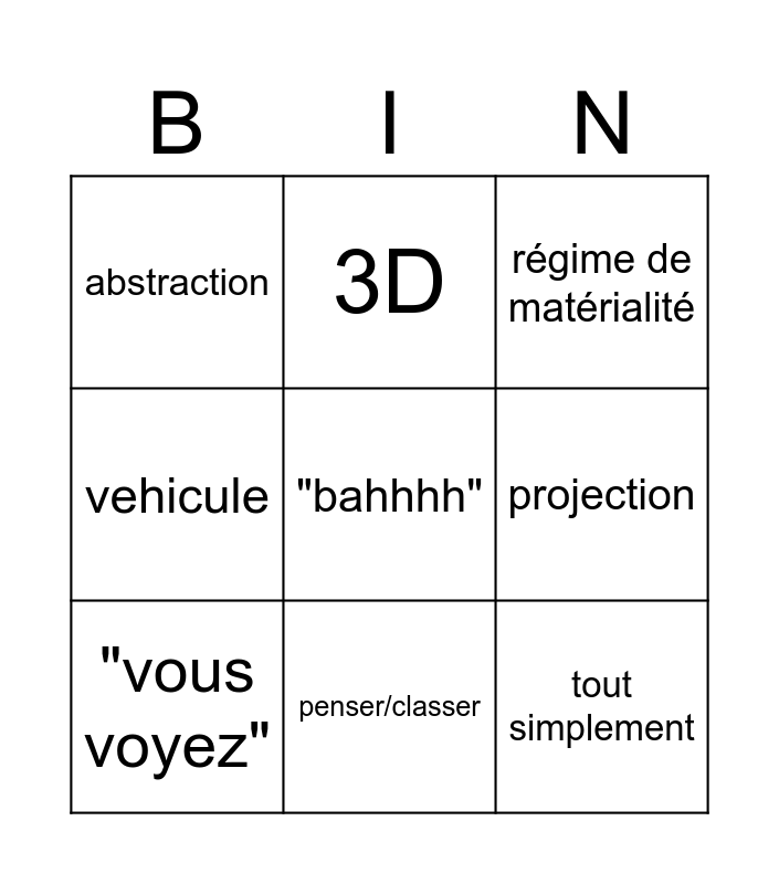 This bingo card has a free space and 8 words: projection, régime de matérialité, 3D, "vous voyez", abstraction, tout simplement, vehicule and penser/classer.