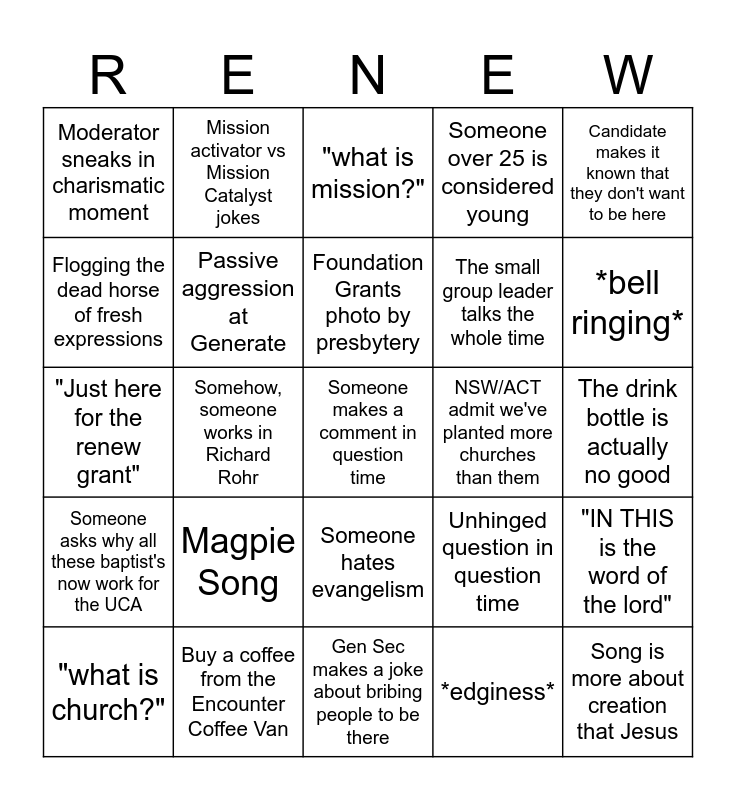 This bingo card has 25 words: Magpie Song, Gen Sec makes a joke about bribing people to be there, Foundation Grants photo by presbytery, "what is church?", Candidate makes it known that they don't want to be here, Moderator sneaks in charismatic moment, Flogging the dead horse of fresh expressions, Mission activator vs Mission Catalyst jokes, NSW/ACT admit we've planted more churches than them, Someone hates evangelism, The small group leader talks the whole time, "Just here for the renew grant", Unhinged question in question time, "IN THIS is the word of the lord", Passive aggression at Generate, Song is more about creation that Jesus, The drink bottle is actually no good, "what is mission?", *bell ringing*, Somehow, someone works in Richard Rohr, Someone makes a comment in question time, Buy a coffee from the Encounter Coffee Van, Someone asks why all these baptist's now work for the UCA, Someone over 25 is considered young and *edginess*.