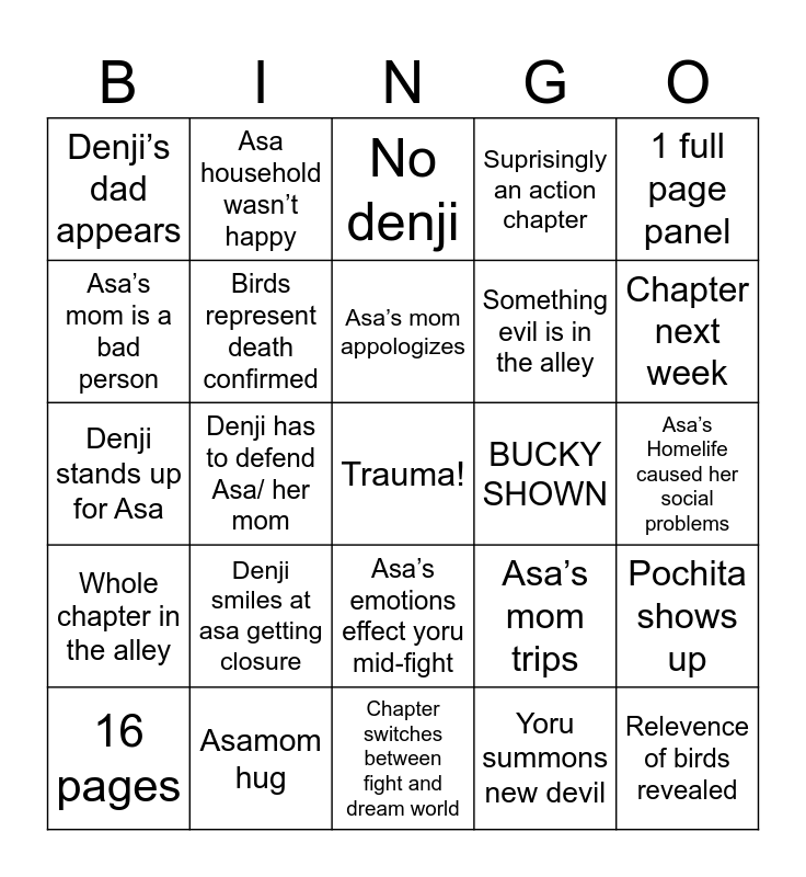 This bingo card has a free space and 24 words: Denji smiles at asa getting closure, Asamom hug, Asa’s mom appologizes, 16 pages, 1 full page panel, Denji’s dad appears, Asa’s mom is a bad person, Asa household wasn’t happy, BUCKY SHOWN, Asa’s emotions effect yoru mid-fight, Something evil is in the alley, Denji stands up for Asa, Asa’s mom trips, Pochita shows up, Birds represent death confirmed, Yoru summons new devil, Asa’s Homelife caused her social problems, No denji, Chapter next week, Denji has to defend Asa/ her mom, Relevence of birds revealed, Whole chapter in the alley, Suprisingly an action chapter and Chapter switches between fight and dream world.