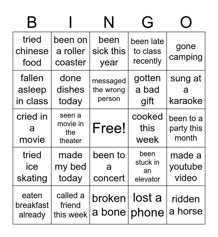 This bingo card has a free space and 29 words: eaten breakfast already, lost my house keys, seen a movie in the theater, traveled to three countries, tried chinese food, been sick this year, done dishes today, made my bed today, cooked this week, called a friend this week, been to a party this month, ridden a horse, broken a bone, lost a phone, sung at a karaoke, dyed your hair, been to a concert, tried ice skating, gone camping, cried in a movie, been stuck in an elevator, build or assembled something, gotten a bad gift, fallen asleep in class, been late to class recently, been on a roller coaster, made a youtube video, messaged the wrong person and found money on the street.