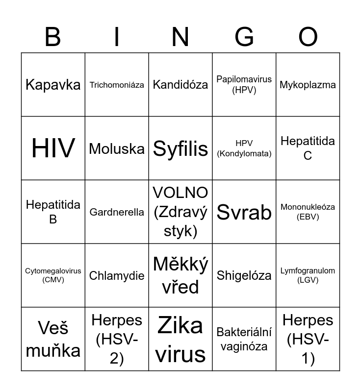 This bingo card has a free space and 24 words: Chlamydie, Herpes (HSV-2), Syfilis, Veš muňka, Mykoplazma, Kapavka, HIV, Trichomoniáza, Svrab, Měkký vřed, HPV (Kondylomata), Hepatitida B, Shigelóza, Lymfogranulom (LGV), Moluska, Bakteriální vaginóza, Mononukleóza (EBV), Kandidóza, Hepatitida C, Gardnerella, Herpes (HSV-1), Cytomegalovirus (CMV), Papilomavirus (HPV) and Zika virus.