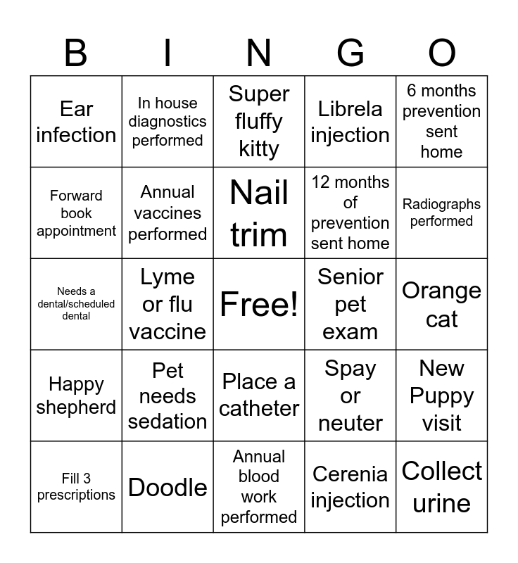 This bingo card has a free space and 28 words: Kitten visit, Doodle, Nail trim, Cerenia injection, 6 months prevention sent home, Ear infection, Annual vaccines performed, Annual blood work performed, Senior pet exam, New Puppy visit, Needs a dental/scheduled dental, Lyme or flu vaccine, Spay or neuter, Collect urine, Forward book appointment, Client does everything recommended, Place a catheter, Librela injection, Radiographs performed, Fill 3 prescriptions, In house diagnostics performed, Google review, 12 months of prevention sent home, Orange cat, Happy shepherd, Pet needs sedation, Super fluffy kitty and Technician visit.