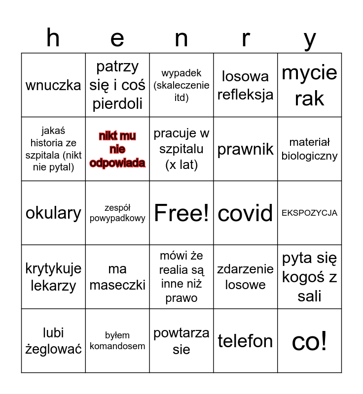 This bingo card has a free space and 24 words: ma maseczki, byłem komandosem, pracuje w szpitalu (x lat), lubi żeglować, mycie rak, wnuczka, jakaś historia ze szpitala (nikt nie pytal), patrzy się i coś pierdoli, covid, mówi że realia są inne niż prawo, prawnik, okulary, zdarzenie losowe, pyta się kogoś z sali, nikt mu nie odpowiada, telefon, EKSPOZYCJA, wypadek (skaleczenie itd), materiał biologiczny, zespół powypadkowy, co!, krytykuje lekarzy, losowa refleksja and powtarza sie.