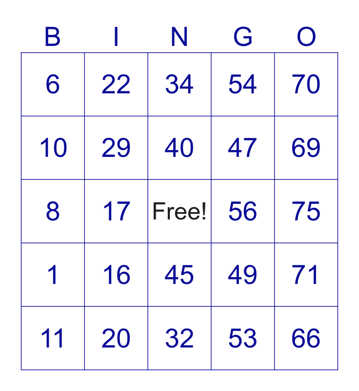 This bingo card has a free space and 24 words: 11, 16, 40, 53, 70, 6, 22, 34, 56, 75, 8, 29, 49, 71, 10, 20, 32, 54, 69, 1, 17, 45, 47 and 66.