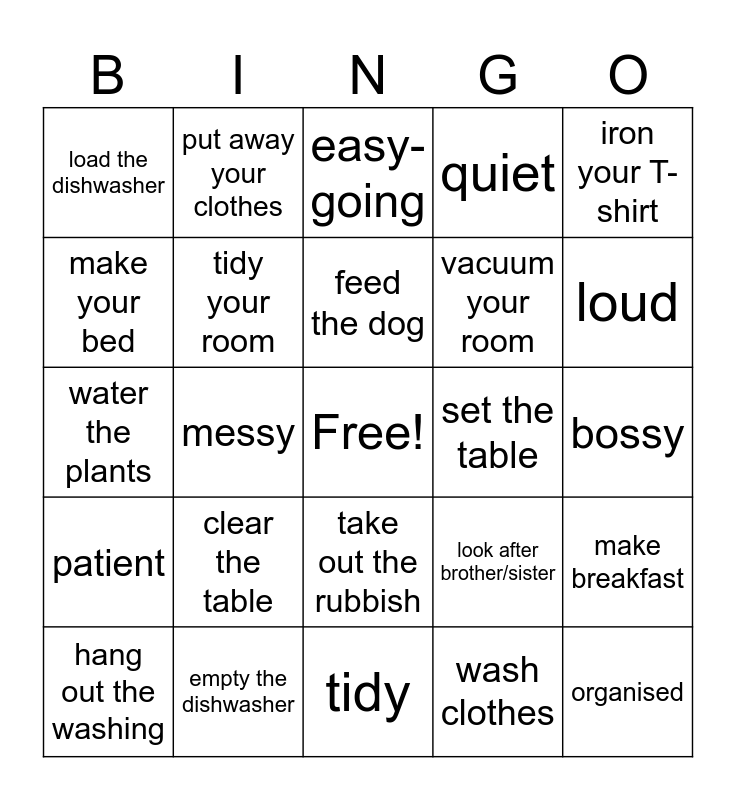 This bingo card has a free space and 24 words: clear the table, empty the dishwasher, feed the dog, hang out the washing, iron your T-shirt, load the dishwasher, make your bed, put away your clothes, set the table, take out the rubbish, vacuum your room, water the plants, look after brother/sister, make breakfast, tidy your room, wash clothes, bossy, easy-going, loud, messy, organised, patient, quiet and tidy.