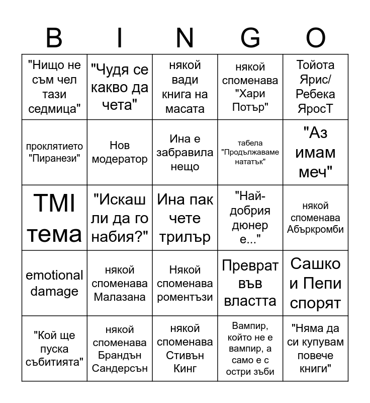 This bingo card has a free space and 24 words: някой споменава Малазана, някой споменава Брандън Сандерсън, Ина е забравила нещо, "Кой ще пуска събитията", Тойота Ярис/Ребека ЯросТ, "Нищо не съм чел тази седмица", проклятието "Пиранези", "Чудя се какво да чета", "Най-добрия дюнер е...", Някой споменава роментъзи, табела "Продължаваме нататък", TMI тема, Преврат във властта, Сашко и Пепи спорят, Нов модератор, Вампир, който не е вампир, а само е с остри зъби, някой споменава Абъркромби, някой вади книга на масата, "Аз имам меч", "Искаш ли да го набия?", "Няма да си купувам повече книги", emotional damage, някой споменава "Хари Потър" and някой споменава Стивън Кинг.