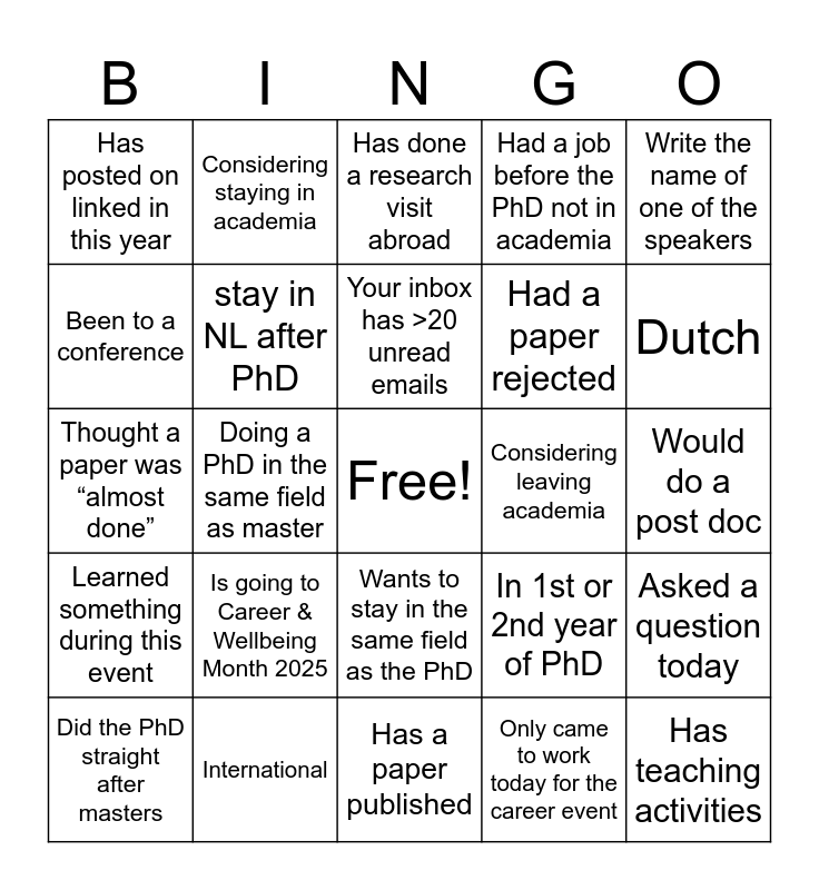 This bingo card has a free space and 27 words: In 1st or 2nd year of PhD, In 3rd+ year of PhD, Had a paper rejected, Has a paper published, Been to a conference, Has done a research visit abroad, Considering staying in academia, Learned something during this event, Considering leaving academia, Asked a question today, Thought a paper was “almost done”, Had a job before the PhD not in academia, Did the PhD straight after masters, International, Dutch, work abroad after PhD, stay in NL after PhD, Your inbox has >20 unread emails, Is going to Career & Wellbeing Month 2025, Has posted on linked in this year, Would do a post doc, Only came to work today for the career event, Doing a PhD in the same field as master, Has teaching activities, Wants to stay in the same field as the PhD, Write the name of one of the speakers and Had a coffee during this event.