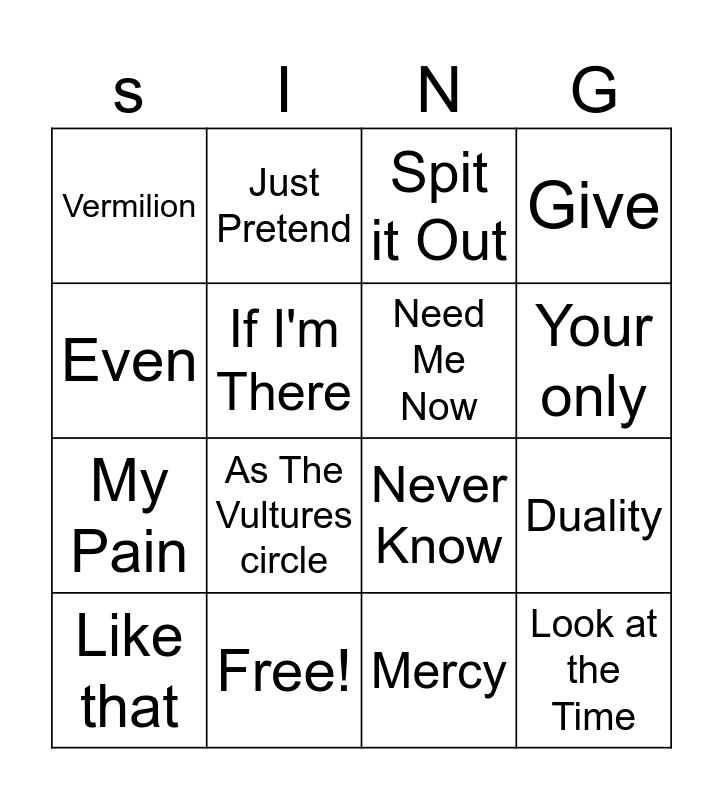 This bingo card has 16 words: Free!, Duality, Spit it Out, Vermilion, My Pain, Just Pretend, Never Know, Mercy, Even, If I'm There, Like that, Give, As The Vultures circle, Your only, Need Me Now and Look at the Time.