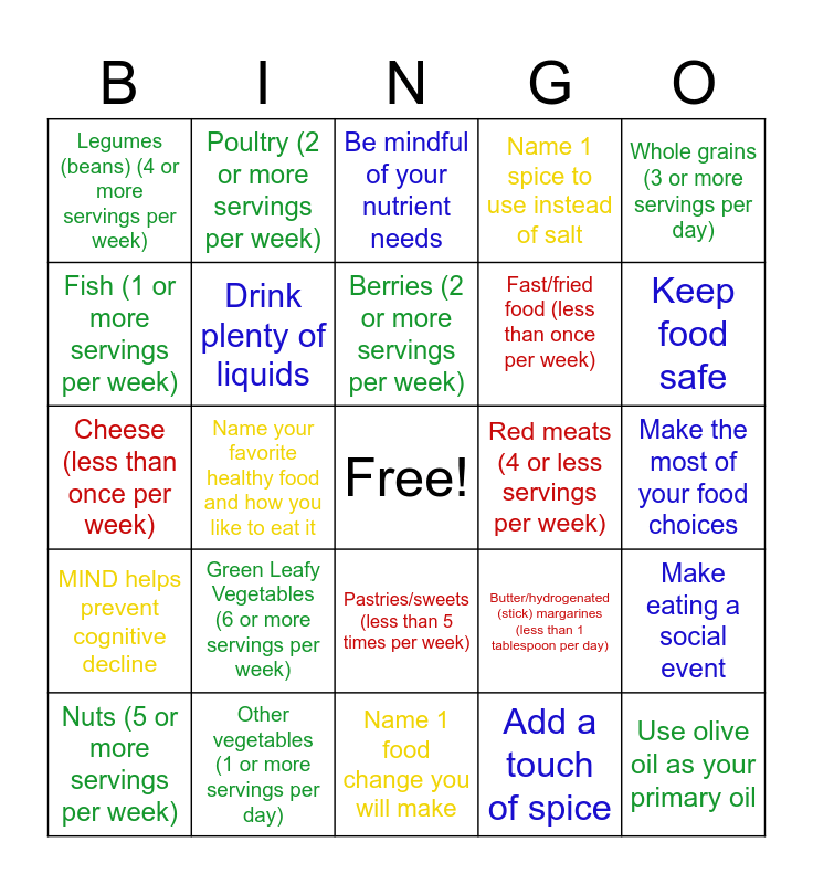 This bingo card has a free space and 24 words: Green Leafy Vegetables (6 or more servings per week), Other vegetables (1 or more servings per day), Berries (2 or more servings per week), Nuts (5 or more servings per week), Whole grains (3 or more servings per day), Legumes (beans) (4 or more servings per week), Fish (1 or more servings per week), Poultry (2 or more servings per week), Red meats (4 or less servings per week), Pastries/sweets (less than 5 times per week), Fast/fried food (less than once per week), Cheese (less than once per week), Butter/hydrogenated (stick) margarines (less than 1 tablespoon per day), Make eating a social event, Drink plenty of liquids, Add a touch of spice, Make the most of your food choices, Be mindful of your nutrient needs, Keep food safe, Name your favorite healthy food and how you like to eat it, Use olive oil as your primary oil, MIND helps prevent cognitive decline, Name 1 spice to use instead of salt and Name 1 food change you will make.