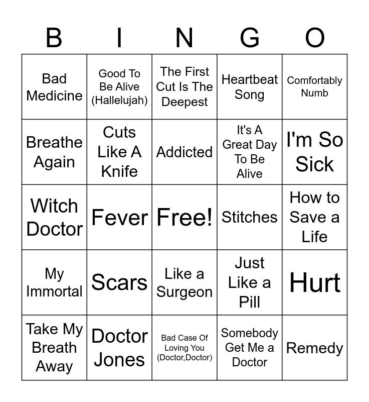 This bingo card has a free space and 31 words: Bad Case Of Loving You (Doctor,Doctor), Dr. Feelgood, Fever, Stayin Alive, Bad Medicine, The First Cut Is The Deepest, Cuts Like A Knife, Just Like a Pill, Stitches, Somebody Get Me a Doctor, How to Save a Life, Remedy, Under Pressure, Hot Blooded, I'm So Sick, Heart Attack, Hurt, Scars, My Immortal, Like a Surgeon, Comfortably Numb, So Sick, Take My Breath Away, Good To Be Alive (Hallelujah), It's A Great Day To Be Alive, Breathe Again, Heartbeat Song, Witch Doctor, Doctor Jones, Addicted and Breathe.
