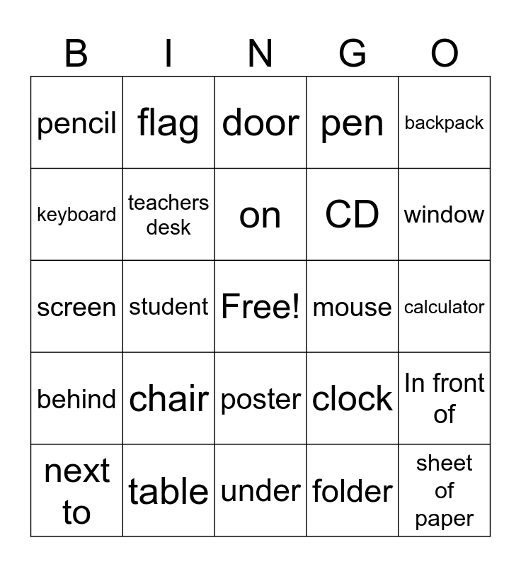 This bingo card has a free space and 24 words: chair, table, on, next to, backpack, pencil, keyboard, flag, mouse, poster, CD, screen, clock, In front of, teachers desk, folder, calculator, door, window, student, sheet of paper, behind, pen and under.