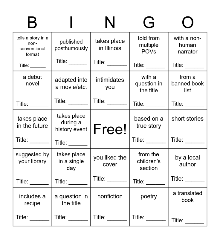 This bingo card has a free space and 24 words: takes place in a single day Title: ______, a question in the title Title: ______, intimidates you Title: ______, includes a recipe Title: ______, with a non-human narrator Title: ______, tells a story in a non-conventional format Title: ______, a debut novel Title: ______, published posthumously Title: ______, based on a true story Title: ______, you liked the cover Title: ______, with a question in the title Title: ______, takes place in the future Title: ______, from the children's section Title: ______, by a local author Title: ______, adapted into a movie/etc. Title: ______, poetry Title: ______, short stories Title: ______, takes place in Illinois Title: ______, from a banned book list Title: ______, takes place during a history event Title: ______, a translated book Title: ______, suggested by your library Title: ______, told from multiple POVs Title: ______ and nonfiction Title: ______.