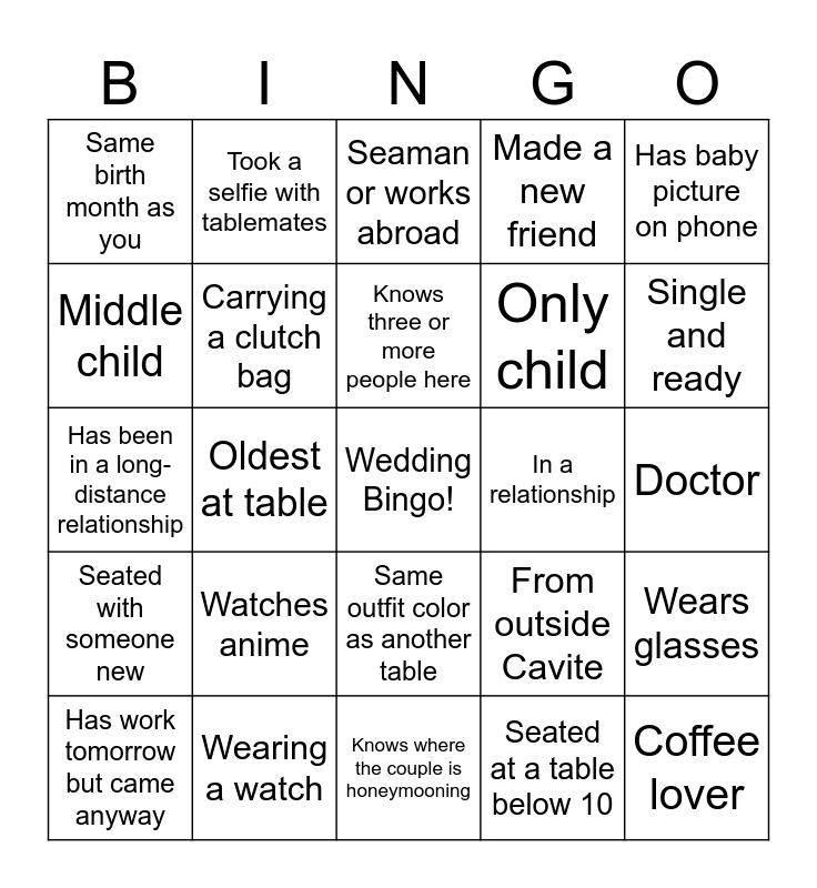 This bingo card has a free space and 36 words: Wearing red, Wearing blue, Wearing green, Carrying a clutch bag, From outside Cavite, Seated with someone new, Knows three or more people here, Has a pet, Has baby picture on phone, Youngest at table, Oldest at table, Made a new friend, Married, In a relationship, Single and ready, Same birth month as you, Older than you, Watches anime, Coffee lover, Seaman or works abroad, Doctor, Wears glasses, Wearing a watch, Has work tomorrow but came anyway, Knows where the couple is honeymooning, Took a selfie with tablemates, Has been in a long-distance relationship, Knows someone with a birthday this month, Only child, Middle child, Been to Picnic Grove or Sky Ranch, Seated at a table 10 or above, Seated at a table below 10, Same outfit color as another table, Asked someone their favorite part of the wedding and Asked someone for relationship advice.
