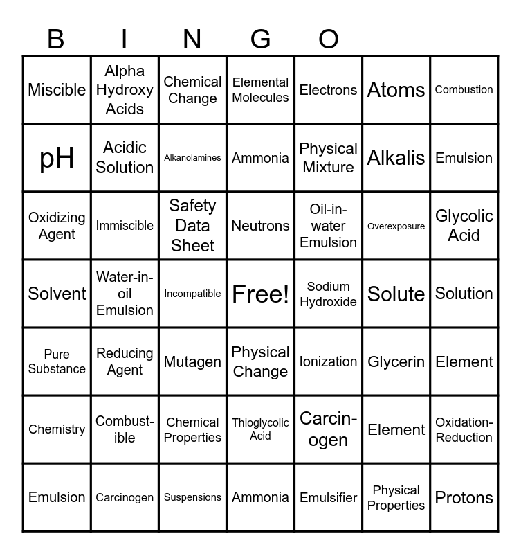 This bingo card has a free space and 60 words: Emulsion, Carcinogen, Alkanolamines, Ammonia, Electrons, Element, Combustion, Cation, Acidic Solution, Chemical Properties, Elemental Molecules, Carcin- ogen, Atoms, Element, Chemistry, Alpha Hydroxy Acids, Chemical Change, Ammonia, Emulsifier, Alkalis, Emulsion, pH, Combust- ible, Alkanolamines, Flammable, Glycerin, Glycolic Acid, Hydrophilic, Immiscible, Incompatible, Ion, Ionization, Lipophilic, Matter, Miscible, Molecule, Mutagen, Neutrons, Oil-in-water Emulsion, Overexposure, Oxidation- Reduction, Oxidizing Agent, Water-in-oil Emulsion, pH scale, Physical Change, Physical Mixture, Physical Properties, Protons, Pure Substance, Reducing Agent, Safety Data Sheet, Silicones, Sodium Hydroxide, Solute, Solution, Solvent, Surfectants, Suspensions, Thioglycolic Acid and Volitile Organic Compound.