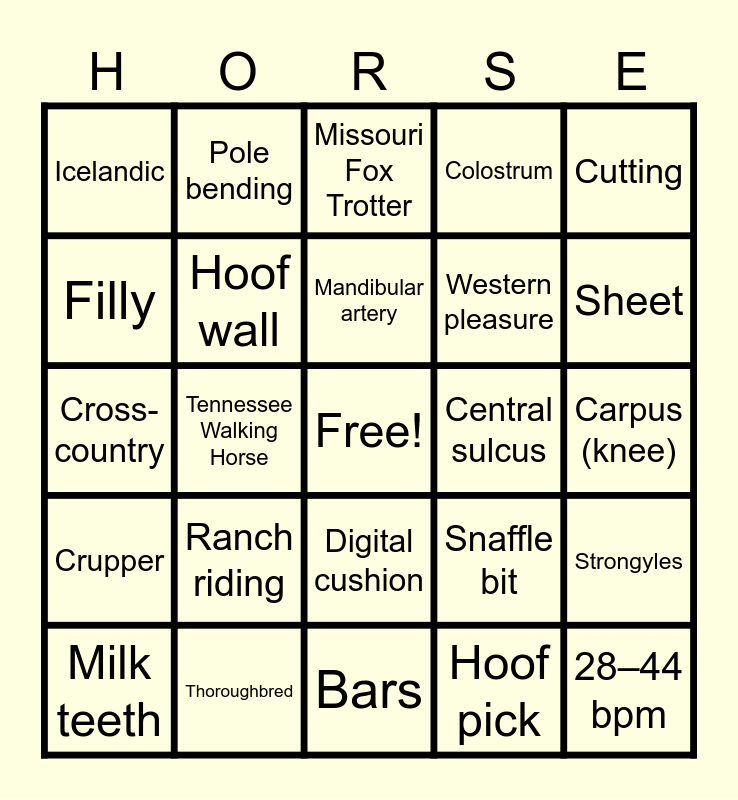 This bingo card has a free space and 30 words: Thoroughbred, Shetland Pony, Tennessee Walking Horse, Percheron, Icelandic, Missouri Fox Trotter, Hoof wall, Digital cushion, Central sulcus, Bars, Carpus (knee), 28–44 bpm, Hoof pick, Tendon boots, Sheet, Draw reins, Snaffle bit, Crupper, Ranch riding, Cutting, Cross-country, Harness racing, Pole bending, Western pleasure, Filly, Colostrum, Strongyles, Milk teeth, Mandibular artery and 8–10 gallons.