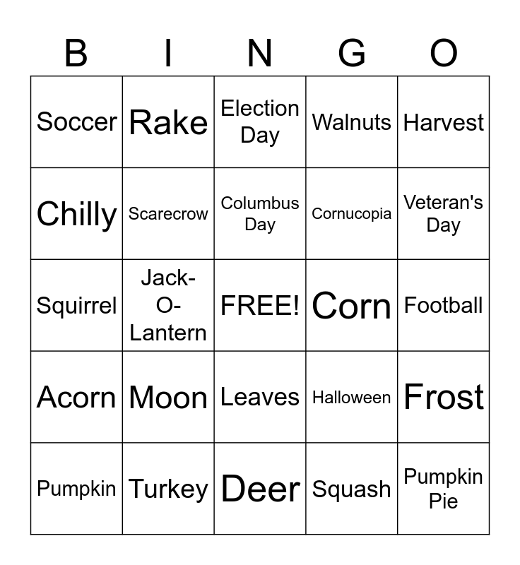 This bingo card has a free space and 24 words: Moon, Turkey, Columbus Day, Pumpkin, Harvest, Soccer, Chilly, Rake, Corn, Leaves, Cornucopia, Squirrel, Halloween, Frost, Scarecrow, Squash, Football, Election Day, Veteran's Day, Jack-O-Lantern, Pumpkin Pie, Acorn, Walnuts and Deer.