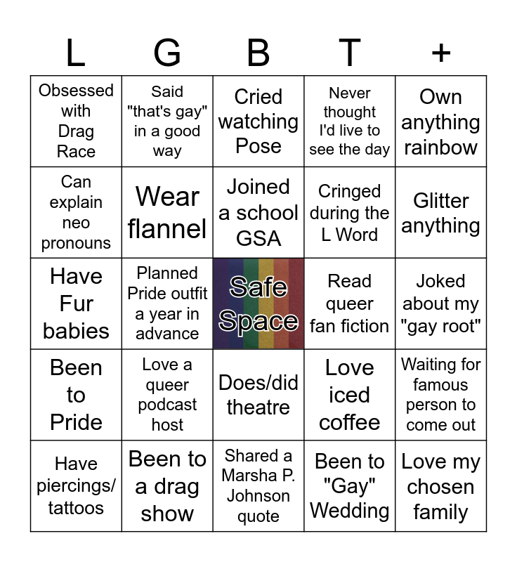 This bingo card has a free space and 24 words: Love a queer podcast host, Been to a drag show, Joined a school GSA, Have piercings/ tattoos, Own anything rainbow, Obsessed with Drag Race, Can explain neo pronouns, Said "that's gay" in a good way, Read queer fan fiction, Does/did theatre, Cringed during the L Word, Have Fur babies, Love iced coffee, Waiting for famous person to come out, Wear flannel, Been to "Gay" Wedding, Joked about my "gay root", Cried watching Pose, Glitter anything, Planned Pride outfit a year in advance, Love my chosen family, Been to Pride, Never thought I'd live to see the day and Shared a Marsha P. Johnson quote.