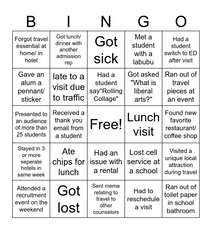 This bingo card has a free space and 24 words: Ate chips for lunch, Got lost, Had a student say"Rolling Collage", Attended a recruitment event on the weekend, Had a student switch to ED after visit, Forgot travel essential at home/ in hotel, Gave an alum a pennant/ sticker, Got lunch/ dinner with another admission rep, Lunch visit, Had an issue with a rental, Got asked "What is liberal arts?", Presented to an audience of more than 25 students, Lost cell service at a school, Visited a unique local attraction during travel, late to a visit due to traffic, Had to reschedule a visit, Found new favorite restaurant/ coffee shop, Got sick, Ran out of travel pieces at an event, Received a thank you email from a student, Ran out of toilet paper in school bathroom, Stayed in 3 or more seperate hotels in same week, Met a student with a labubu and Sent meme relating to travel to other counselors.
