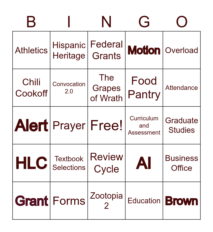 This bingo card has a free space and 29 words: Grant, VPAA, Prayer, Second, Athletics, Federal Grants, Convocation 2.0, Textbook Selections, Curriculum and Assessment, Forms, Graduate Studies, Brown, Zootopia 2, Education, Attendance, Organization, Review Cycle, HLC, Overload, Alert, AI, Unprecedented, Food Pantry, Chili Cookoff, Motion, Hispanic Heritage, Business Office, The Grapes of Wrath and Fall Break.