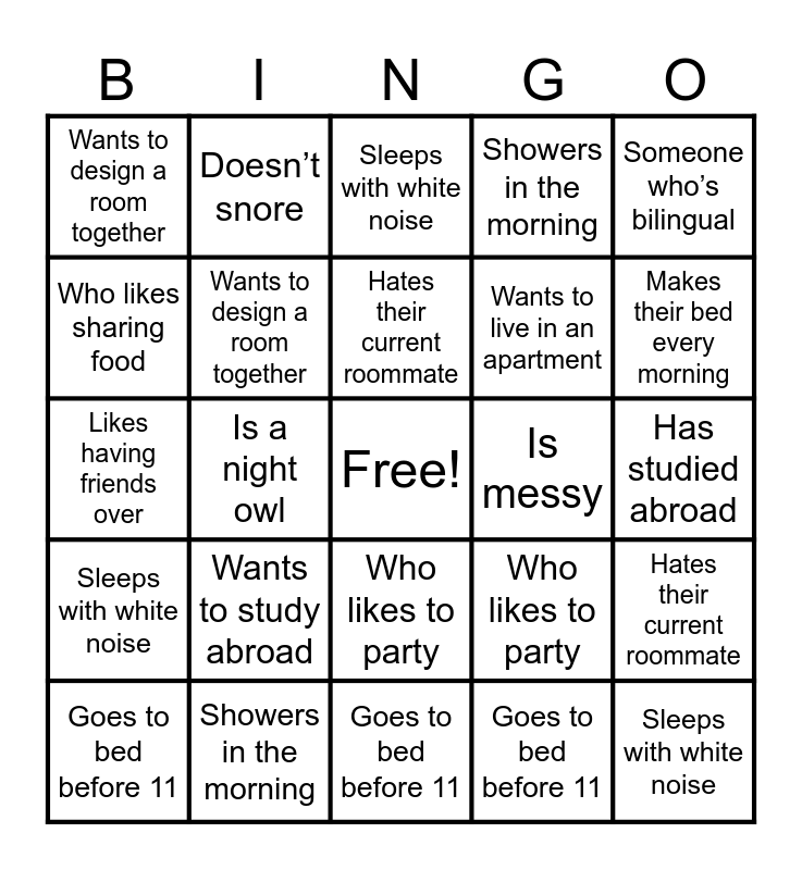 This bingo card has a free space and 72 words: Snores, Doesn’t snore, Is a night owl, Is a morning dove, Is in your same college, Showers at night, Showers in the morning, Wants to live in a brownstone, Wants to live in an apartment, Prefers a quiet space, Goes to bed before 11, Wakes up before 7, Makes their bed every morning, Wants to design a room together, Who likes sharing food, Likes having friends over, Who likes to party, Someone who’s bilingual, Is vegetarian, Has studied abroad, Wants to study abroad, Sleeps with white noise, Hates their current roommate, Is messy, Snores, Doesn’t snore, Is a night owl, Is a morning dove, Is in your same college, Showers at night, Showers in the morning, Wants to live in a brownstone, Wants to live in an apartment, Prefers a quiet space, Goes to bed before 11, Wakes up before 7, Makes their bed every morning, Wants to design a room together, Who likes sharing food, Likes having friends over, Who likes to party, Someone who’s bilingual, Is vegetarian, Has studied abroad, Wants to study abroad, Sleeps with white noise, Hates their current roommate, Is messy, Snores, Doesn’t snore, Is a night owl, Is a morning dove, Is in your same college, Is messy, Has studied abroad, Wants to study abroad, Sleeps with white noise, Hates their current roommate, Showers at night, Showers in the morning, Wants to live in a brownstone, Wants to live in an apartment, Prefers a quiet space, Goes to bed before 11, Wakes up before 7, Makes their bed every morning, Wants to design a room together, Who likes sharing food, Likes having friends over, Who likes to party, Someone who’s bilingual and Is vegetarian/vegan.