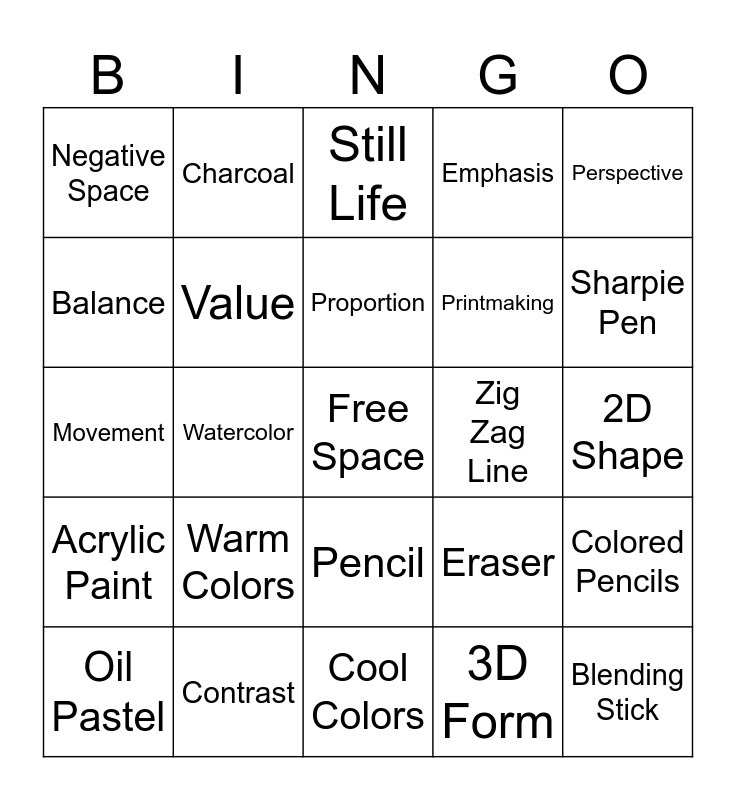 This bingo card has a free space and 31 words: Cool Colors, Pattern, Watercolor, Contour Drawing, Negative Space, Still Life, Value, Eraser, Zig Zag Line, 3D Form, 2D Shape, Blending Stick, Abstract Art, Self-Portrait, Sharpie Pen, Positive Space, Colored Pencils, Warm Colors, Acrylic Paint, Pencil, Perspective, Texture, Oil Pastel, Charcoal, Printmaking, Balance, Emphasis, Movement, Contrast, Proportion and Unity.