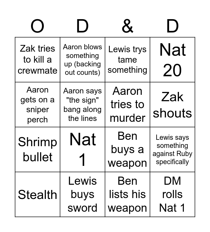 This bingo card has 16 words: Lewis buys sword, Lewis says something against Ruby specifically, Lewis trys tame something, Zak tries to kill a crewmate, Shrimp bullet, Aaron blows something up (backing out counts), Ben buys a weapon, Ben lists his weapon, Aaron gets on a sniper perch, Aaron says "the sign" bang along the lines, Stealth, Nat 20, Nat 1, Zak shouts, Aaron tries to murder and DM rolls Nat 1.