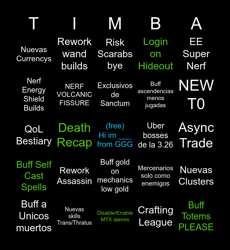 This bingo card has a free space and 24 words: Rework Assassin, Nuevas skills Trans/Thratus, Exclusivos de Sanctum, Buff a Unicos muertos, EE Super Nerf, Nuevas Currencys, Nerf Energy Shield Builds, Rework wand builds, Uber bosses de la 3.26, Buff gold on mechanics low gold, Buff ascendencias menos jugadas, QoL Bestiary, Mercenarios solo como enemigos, Nuevas Clusters, NERF VOLCANIC FISSURE, Crafting League, Async Trade, Risk Scarabs bye, NEW T0, Death Recap, Buff Totems PLEASE, Buff Self Cast Spells, Login on Hideout and Disable/Enable MTX ajenos.