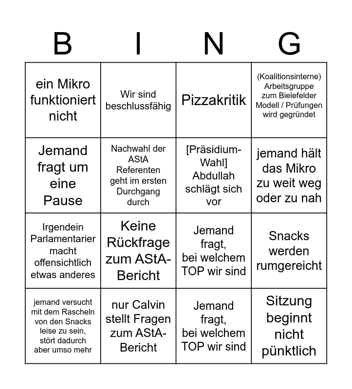 This bingo card has 18 words: Keine Rückfrage zum AStA-Bericht, Sitzung beginnt nicht pünktlich, Pizzakritik, ein Mikro funktioniert nicht, Jemand fragt, bei welchem TOP wir sind, (Koalitionsinterne) Arbeitsgruppe zum Bielefelder Modell / Prüfungen wird gegründet, jemand versucht mit dem Rascheln von den Snacks leise zu sein, stört dadurch aber umso mehr, Wir sind beschlussfähig, jemand hält das Mikro zu weit weg oder zu nah, Irgendein Parlamentarier macht offensichtlich etwas anderes, Jemand fragt, bei welchem TOP wir sind, Jemand fragt um eine Pause, Snacks werden rumgereicht, Nachwahl der AStA Referenten geht im ersten Durchgang durch, [Präsidium-Wahl] Abdullah schlägt sich vor, Beschwerde, dass nachzuwählende Öffi-Referentin nicht da ist, nur Calvin stellt Fragen zum AStA-Bericht and mehr vegane Pizza.