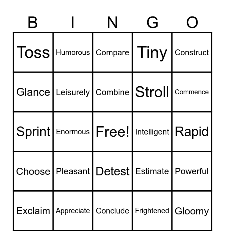 This bingo card has a free space and 40 words: Joyful, Sprint, Admit, Leisurely, Appreciate, Detest, Combine, Improve, Construct, Choose, Enormous, Tiny, Gloomy, Rapid, Intelligent, Pleasant, Furious, Toss, Companion, Compare, Powerful, Frightened, Stroll, Glance, Discuss, Sipport, Obtain, Demonstrate, Ponder, Demand, Utilize, Exclaim, Destroy, Estimate, Commence, Conclude, Assemble, Thought, Humorous and Challenging.