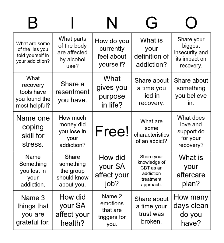 This bingo card has a free space and 48 words: Share about a time you experienced Shame., How many days clean do you have?, Share about your relapse prevention plan., Name 2 emotions that are triggers for you., Share something the group should know about you., Share about something you struggle to accept., What parts of the body are affected by alcohol use?, What makes you feel safe and secure?, What recovery tools have you found the most helpful?, Share about something you’d like to make amends for., Share a resentment you have., What is your definition of addiction?, What is your aftercare plan?, Share your knowledge of CBT as an addiction treatment approach., Share about your family’s relationship with substances., What are 2 slang terms for cocaine?, What gives you purpose in life?, What are some characteristics of an addict?, Share about something that gives you hope., Share your biggest insecurity and its impact on recovery., How much money did you lose in your addiction?, Share about a time your trust was broken., What are some of the lies you told yourself in your addiction?, Share about a time you lied in recovery., What is your definition of Recovery?, Share about something you believe in., Name 3 things that you are grateful for., Share about your knowledge of the addiction cycle., How did your SA affect your job?, Name Something you lost in your addiction., How can the group help you meet your goals?, Name 2 of your triggers., What do you value most?, Name 3 barriers to success in recovery., How did your SA affect your health?, What is a lesson you have learned in recovery?, Name one of the 12 steps., What does love and support do for your recovery?, Describe your life after 1 year of sobriety., Describe one fear you have about recovery., What currently holds you back from living the life you want?, Name 3 things you have control over., How do you currently feel about yourself?, What is something you can do for relaxation?, Name one coping skill for stress., Share about your knowledge of trauma., Share about your healing process. and Name 3 types of opiates..